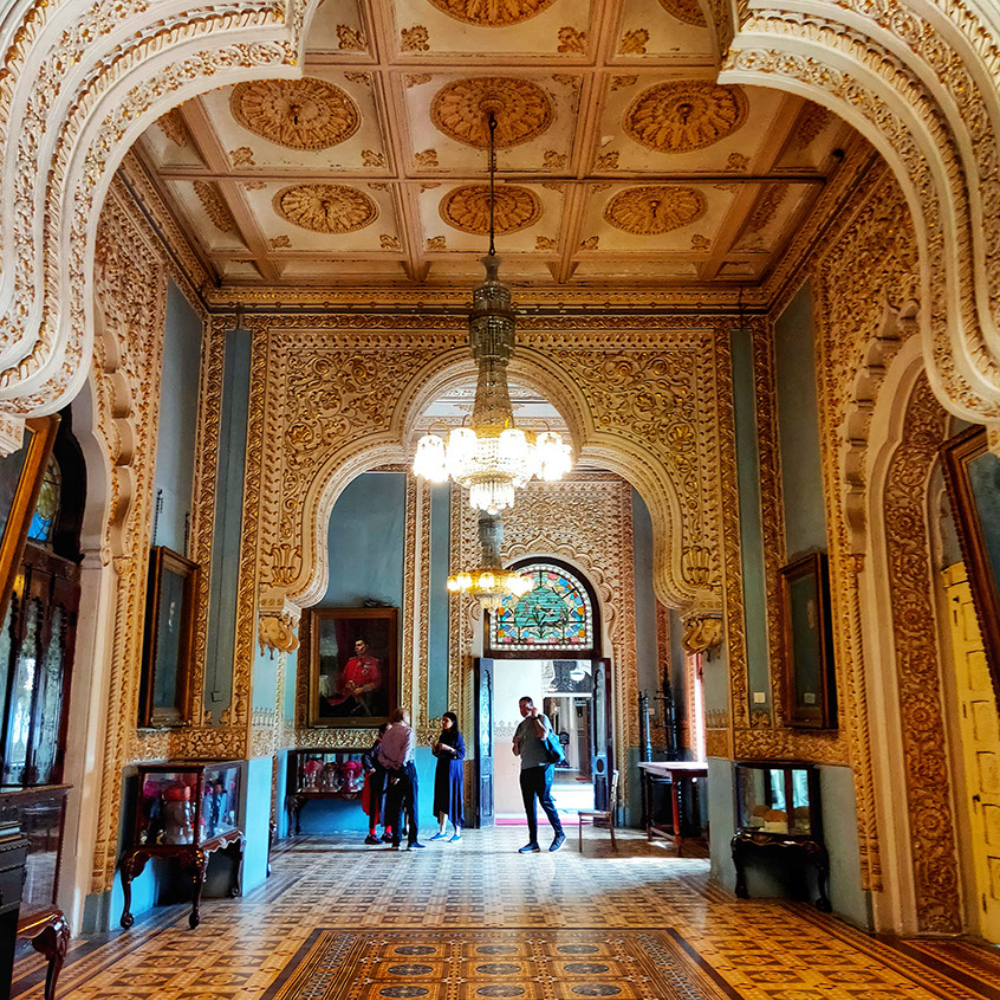 The Durbar Hall, one of the palace’s most iconic spaces, is particularly striking. With its Venetian mosaic flooring, Belgian stained glass windows, and grand arches, the hall was used for royal ceremonies and gatherings. The ceiling, decorated with intricate designs, adds to the room’s opulence, making it a true masterpiece of craftsmanship.